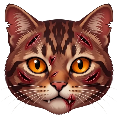 A very darkred-brown tabby cat head with scars and bright orange eyes and a lot of scars and torn ears emoji