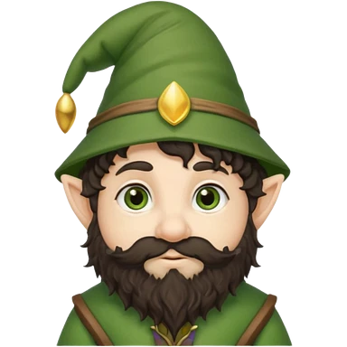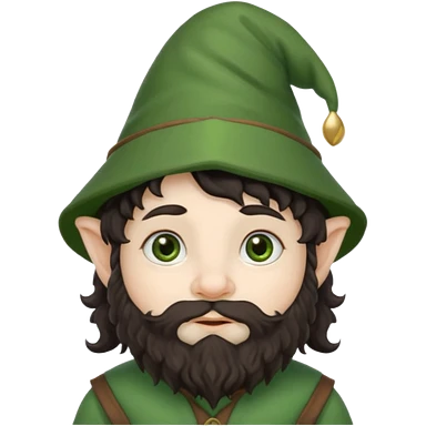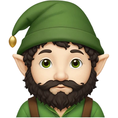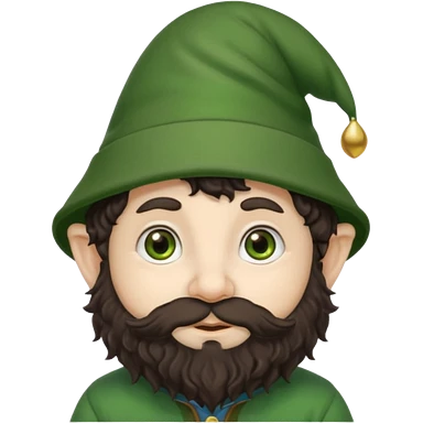 Gnomo con, capelli ricci scuri, occhi marroni, cappello verde emoji