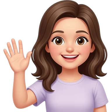 девушка более счастливая махает рукой, феолетово розовая одежда, приветствует на лекции emoji