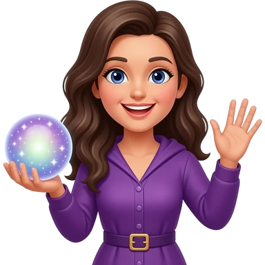 Счастливая женщина держит магический шар и махает рукой в фиолетовой одежде emoji
