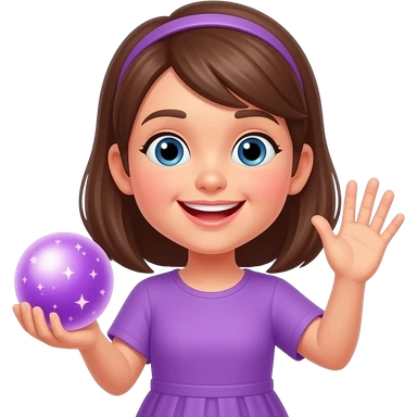 Счастливая девушка держит магический шар и махает рукой в фиолетовой одежде emoji