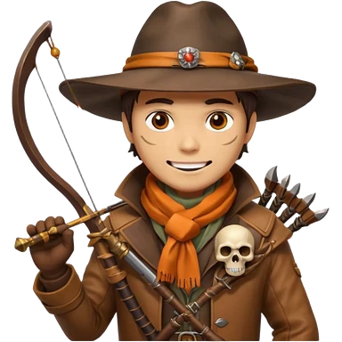 male human monster hunter emoji, wearing brown leather coat and wide hat, holding crossbow or rifle, with amulet shaped like skull, Halloween fantasy theme, confident smile, orange scarf, Apple emoji style, clean white background, square image emoji