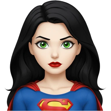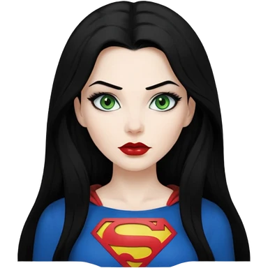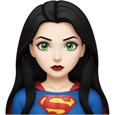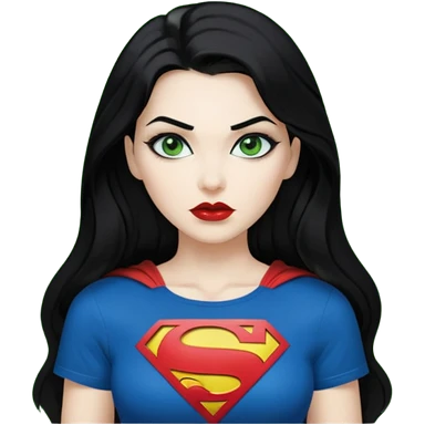 Black haired woman, green eyes, black lipstick, white skin, black t shirt, sharp face, long hair, feminine, Devine, superman logo on t shirt emoji