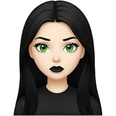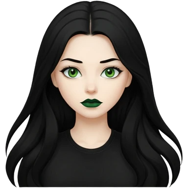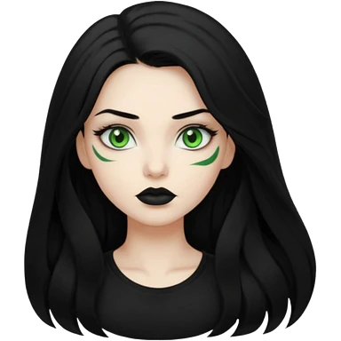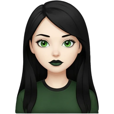Black haired woman, green eyes, black lipstick, white skin, black t shirt, sharp face, long hair emoji
