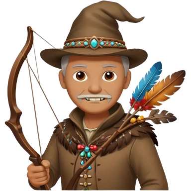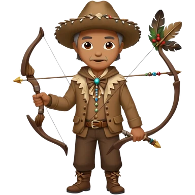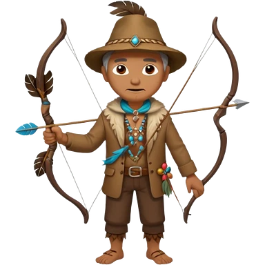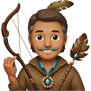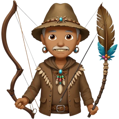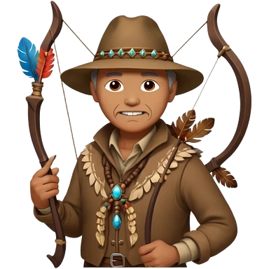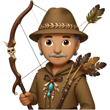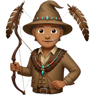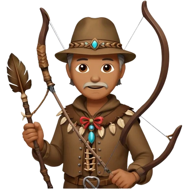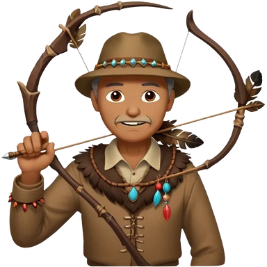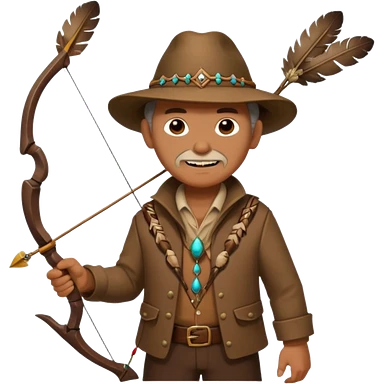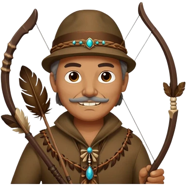 The classic image of a middle-aged uncle hunter carrying a bow, dressed in brown clothes, with some ornaments made of feathers, bones or teeth on his body. emoji