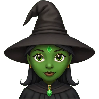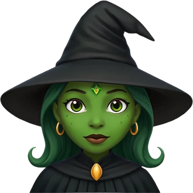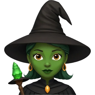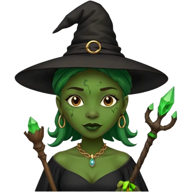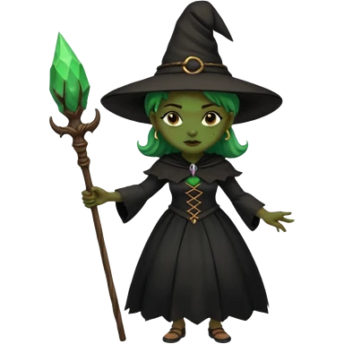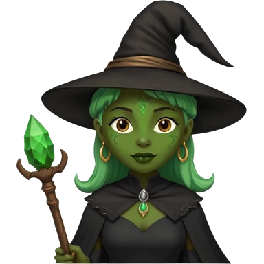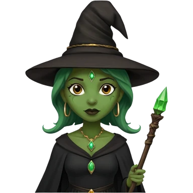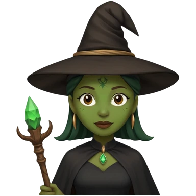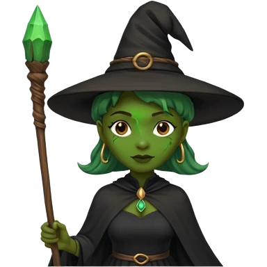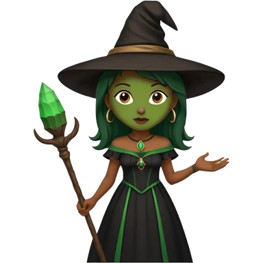ведьма-африканка с зеленой кожей с широким носом в черном платье и черной ведьминской шляпе с посохом и длинными черными волосами emoji | AI Emoji Generator