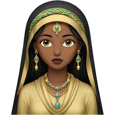 Apariencia: Mujer joven, morena, de gran belleza y porte misterioso. -Rostro: Ojos grandes y negros, mirada intensa y fija; labios marcados. -Cabello: Negro, largo y brillante, suele ir cubierto parcialmente por un velo o pañuelo oriental. Cuerpo conpleto emoji