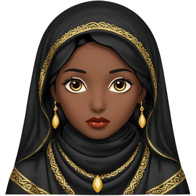 Apariencia: Mujer joven, morena, de gran belleza y porte misterioso. -Rostro: Ojos grandes y negros, mirada intensa y fija; labios marcados. -Cabello: Negro, largo y brillante, suele ir cubierto parcialmente por un velo o pañuelo oriental. emoji