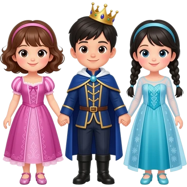 52개월 한국인 세쌍둥이 이모지를 만들어줘. 여아, 남아, 여아 순으로 배치해주고, 서로 손을 잡고 있게해줘. 아이들은 모두 한국인이야. 여자아이들은 공주 드레스를 입었어. 왼쪽 첫째 여아는 귀여운 퐁글한 갈색 곱슬머리 단발기장에 분홍색 라푼젤 드레스를 입었고, 반짝거리는 구두를 신었어. 가운데 남아는 중세 왕자가 입는 남색 멋진 정장을 입고 있어(망또와 왕관 없이). 오른쪽 여아는 엘사드레스를 입고, 머리는 검정색 양 갈래 꽈배기를 땋은 머리야(가슴까지 오는 기장). 엘사구두를 신고. 귀엽고 사랑스럽게 만들어줘. emoji