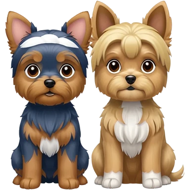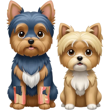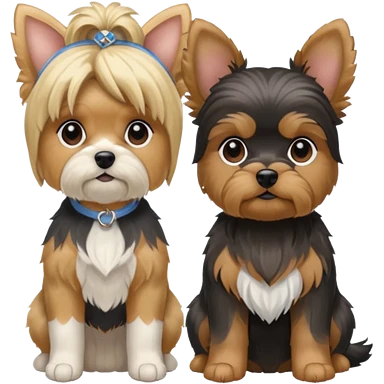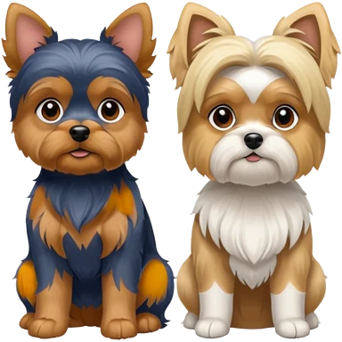 Generate a blue and tan purebred yorkie with a blonde shi tzu yorkie mix with floppy ears sitting next to each other. Make them the same soze emoji