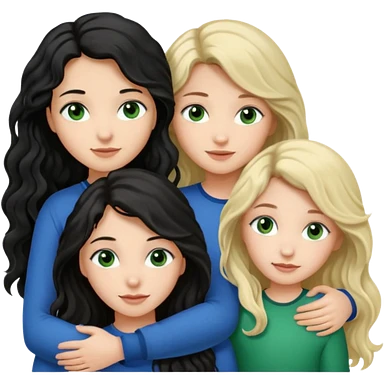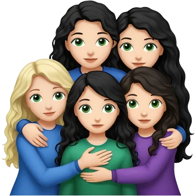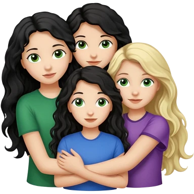 Компанія дівчат троє одна дівчина з чорним волоссям хвилястим довгим карими очима, друга з блондинистим довгим волоссям блакитними очима, третя з темним каштановим волоссям і зеленими очима, вони усі обіймаються emoji