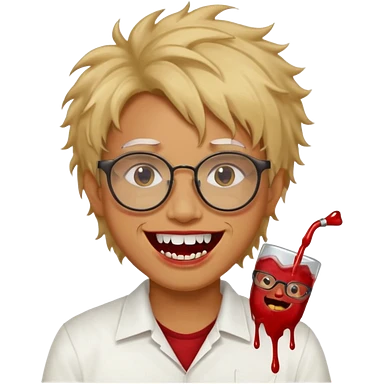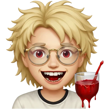Cabelo bagunçado com oculos sorrindo com metade do rosto com dente de ouro e saindo sangue da boca emoji