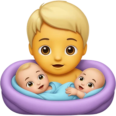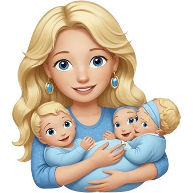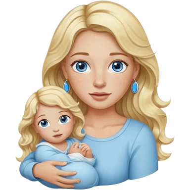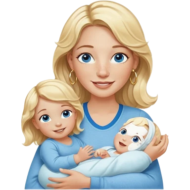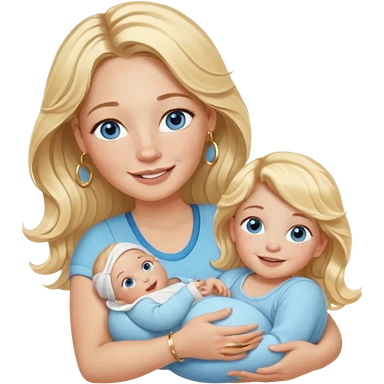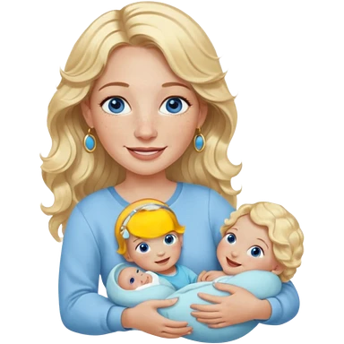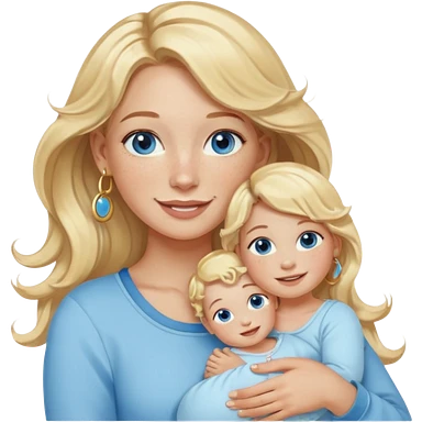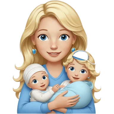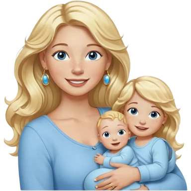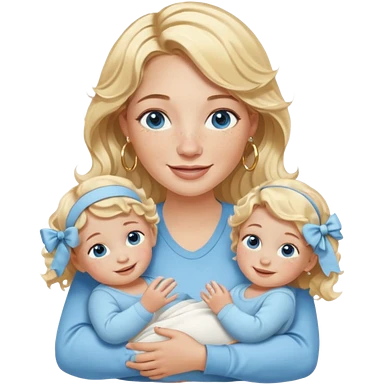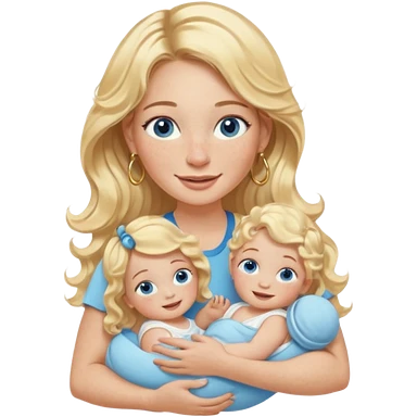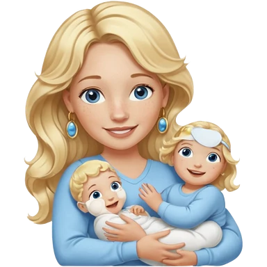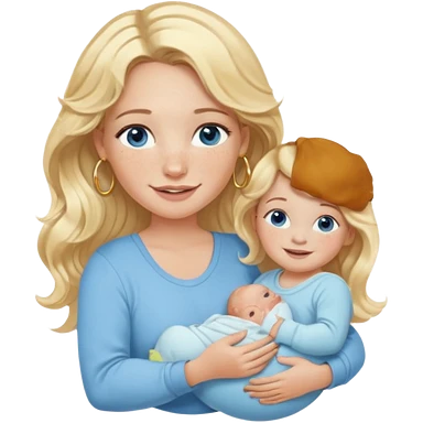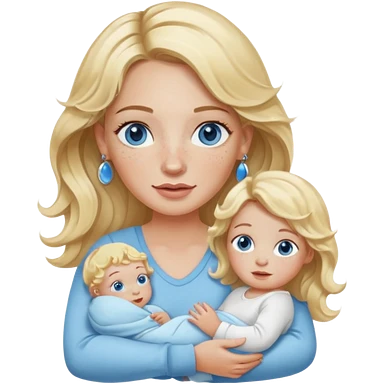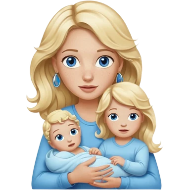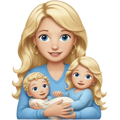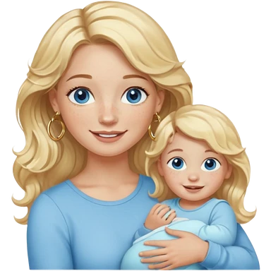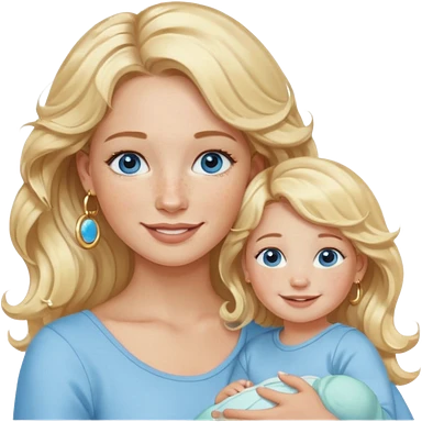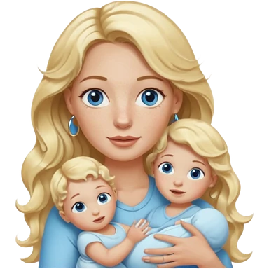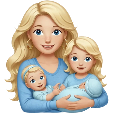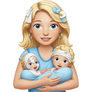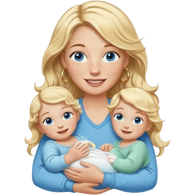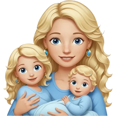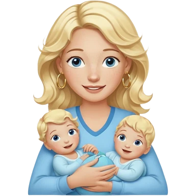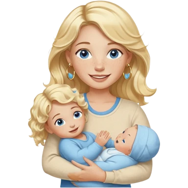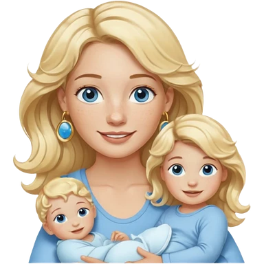 Wavy blonde, white woman with blue eyes, freckles hoop earrings, holding babies emoji