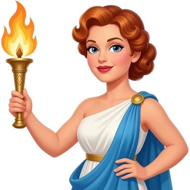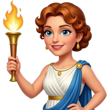 Columbia Pictures Torch Lady with auburn curly low bun hair, white peplos, one holding torch, one holding blue drape emoji