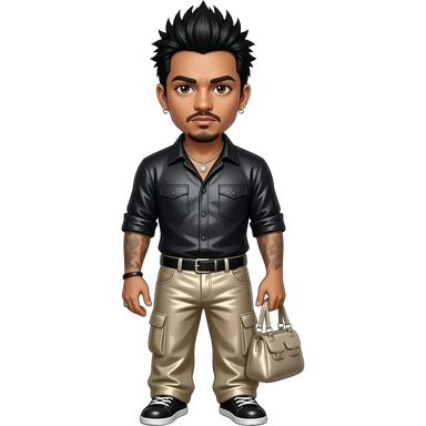 Chino Moreno with brown eyes, black spiky hair, black metallic metal shirt, beige metallic metal baggy pants, necklace and earrings emoji