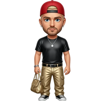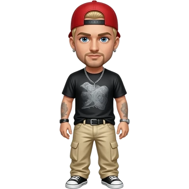 Fred Durst with blue eyes, blonde buzz cut hair, red cap, black metallic metal t-shirt, beige metallic metal baggy pants, necklace and earrings emoji