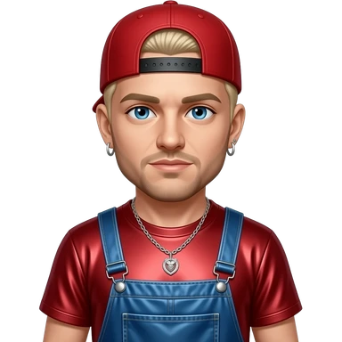 Fred Durst with blue eyes, blonde buzz cut hair, red cap, red metallic metal t-shirt, blue metallic metal baggy pants, necklace and earrings emoji