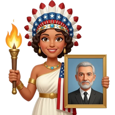 Columbia Pictures Torch Lady with dark brown curly low bun hair, American headdress, ivory peplos, one holding torch, one holding American drape emoji