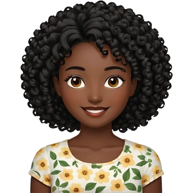 a young woman.She has voluminous, curly black hair that frames her face beautifully. Her skin tone is black light and glowing, and she has a subtle, natural makeup look. She’s smiling softly at the camera. She is wearing a white floral top emoji