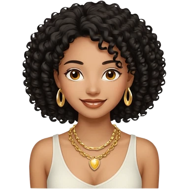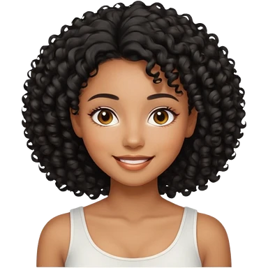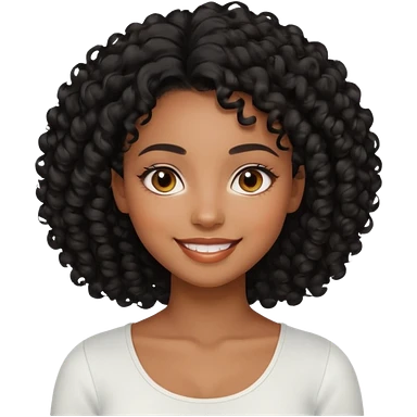 a young woman.She has voluminous, curly black hair that frames her face beautifully. Her skin tone is black light and glowing, and she has a subtle, natural makeup look. She’s smiling softly at the camera. She is wearing a white top emoji