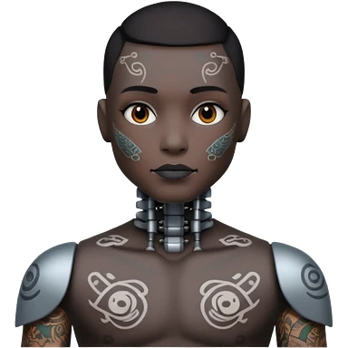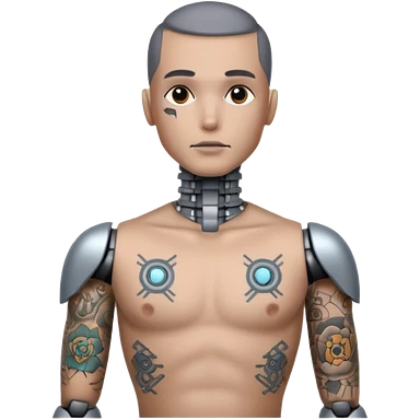 Tatooed robot, big many tatooes on chest, neck and face emoji