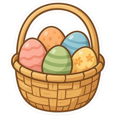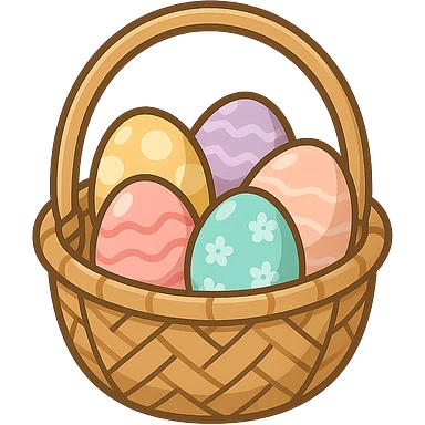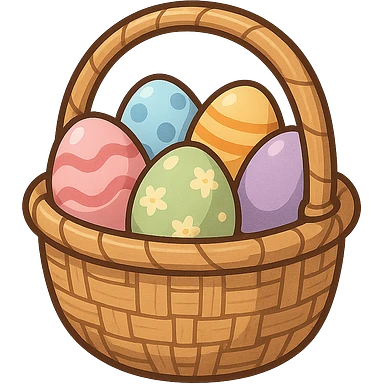 一个竹子编的篮子,篮子里面装着许多复活节的复活蛋 emoji