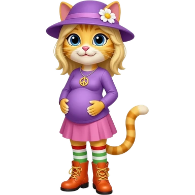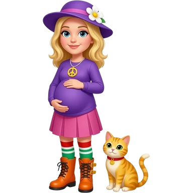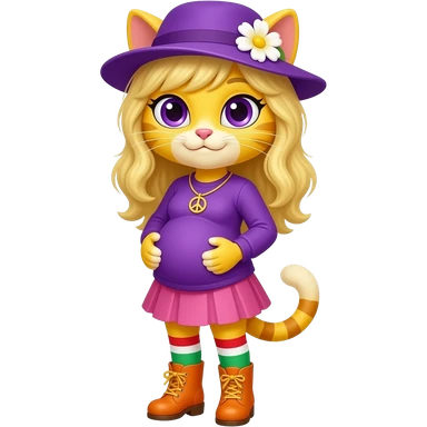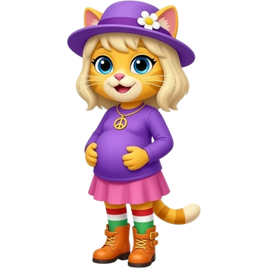 Yellow cat with blonde hair purple hat with white flower peace sign necklace purple long sleeved shirt pink skirt long red white green socks orange boots with yellow buckles big pregnant belly emoji