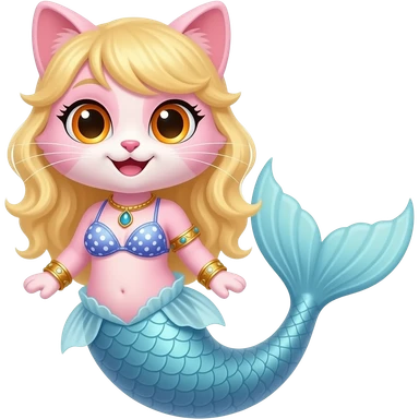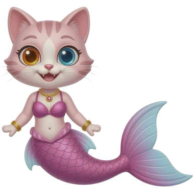 a light pink cat with orange eye blue eye smile #E37383 hair golden bracelets #FFB6C1 top bikini #FF69B4 mermaid tail with #F8C8DC tail fins emoji