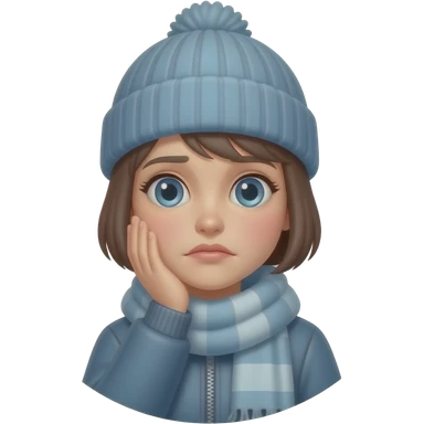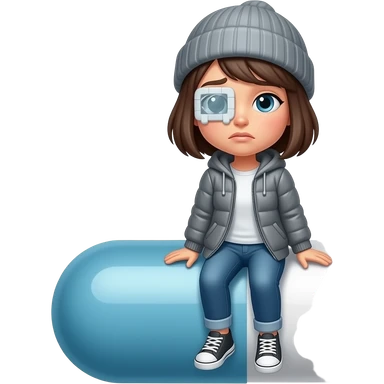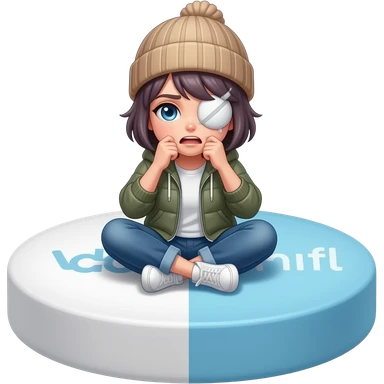 A Tomgirl with short hair and beanie is seated on a large round Adderall and shaking from cold. She has an injured eye and her gallbladder is out. emoji