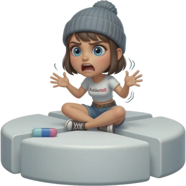 Tomgirl with short hair and beanie is shaking violently. The shakinf is indicated by a shimmering outline. She is sitting on a giant round Adderall pill. She had one injured eye and looks shocked. emoji