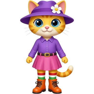 Yellow cat with blonde hair purple hat with white flower purple long sleeved shirt pink skirt red white green socks orange boots emoji