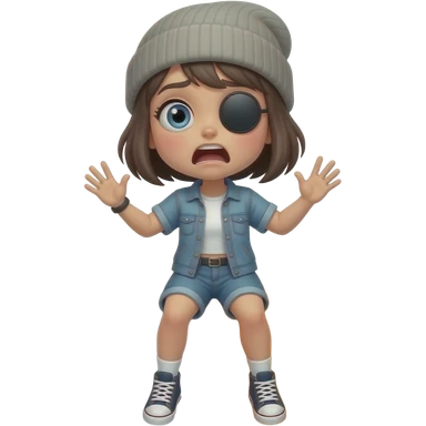 Tomgirl with short hair and beanie is shaking from cold. She is on a round Adderall pill. She had one injured eye. emoji