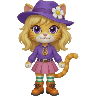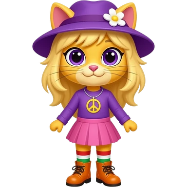 Yellow cat anthro with purple eyes blonde hair purple hat with white flower peace sign necklace purple long sleeved shirt pink skirt long red white green socks orange boots with yellow buckles emoji