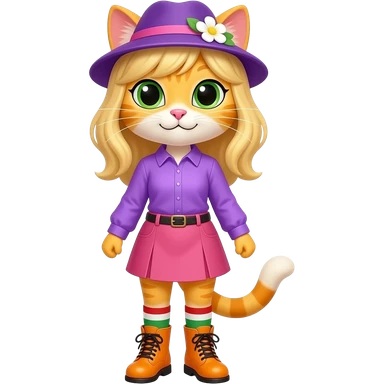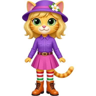 Yellow cat with blonde hair purple hat with white flower purple long sleeved shirt pink skirt red white green long socks orange boots with yellow buckles emoji