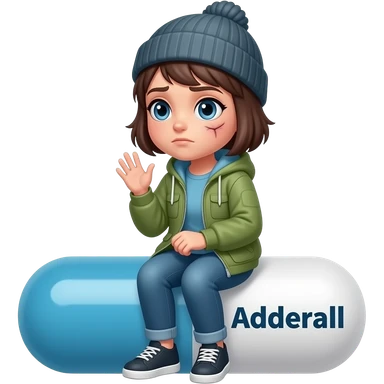 Tomgirl with short hair and beanie is shaking from cold. She is seated on an Adderall pill. She has one bruise under her eye. emoji