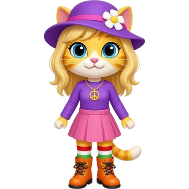 Yellow cat with blonde hair purple hat with white flower peace sign necklace purple long sleeved shirt pink skirt long red white green socks orange boots with yellow buckles emoji