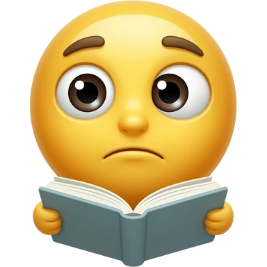 고민을 하는 이모지 왼쪽으로 기우뚱 오른쪽으로 기우뚱하면서 손에는 책을 들고 있는 이미지, 남성의 형태가 아니라 노란색 기본 이모지의 형태, 눈알의 형태를 좀 더 단순하게 표현하고, 책의 커버 색깔 = ' 5cFFD1' emoji | AI Emoji Generator