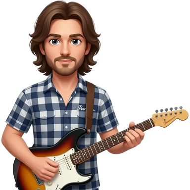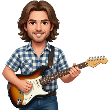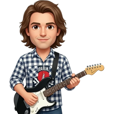 man with long brown hair, electro guitar, checkered shirt logo "pearl jam" on shirt emoji