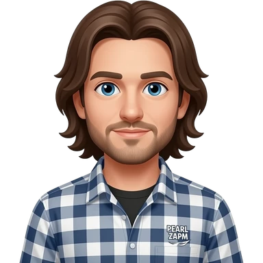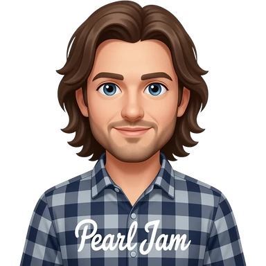 man with long brown hair, checkered shirt logo "pearl jam" on shirt emoji