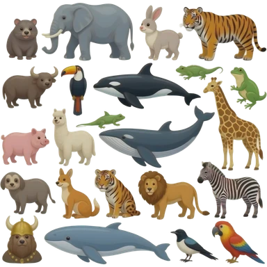 Quail Wombat Elephant Rabbit Tiger Yak Umbrella-bird Iguana Orca Pig Alpaca Sloth Dog Frog Giraffe Humpback whale Jaguar Kangaroo Lion Zebra foX Cockatoo Viking Beluga whale Nightingale Magpie emoji