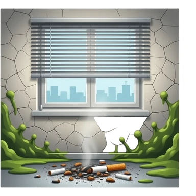 cigarette ashes, black mold, broken windows, broken blinds emoji