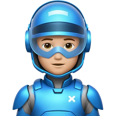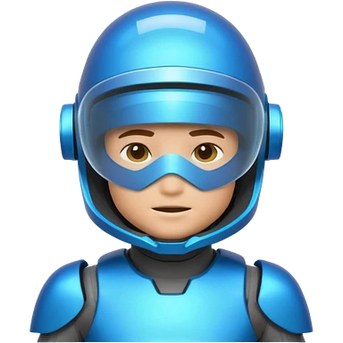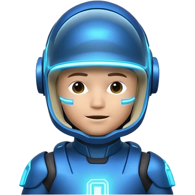 “Futuristic Roblox boy emoji, 2050 style. Blue neon visor, cyber helmet, metallic skin glow, hologram lines, tech-suit with glowing seams, soft neon background.” emoji