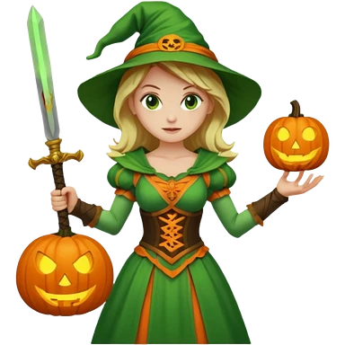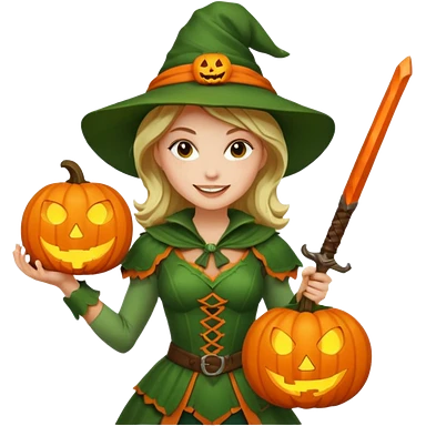 Woman Hunter With Jack o Lantern, wearing green costume, with sword emoji
