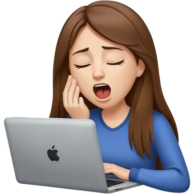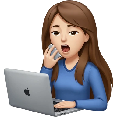 brown hair woman with long straighrt hair holding laptop and yawning from tiredness. looking tired emoji