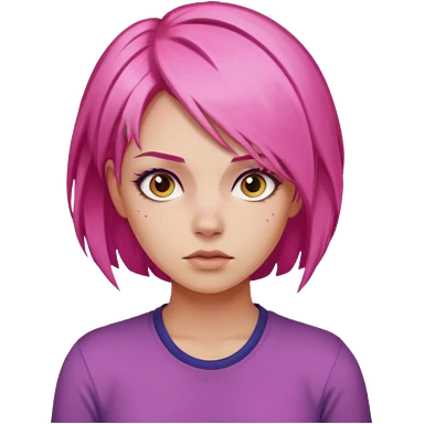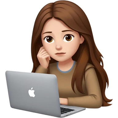 create a woman long hair brown, sitting with her macbook looking tired emoji
