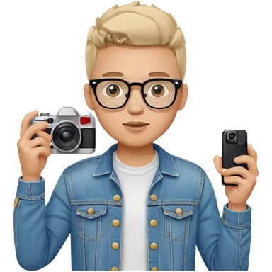 Young male, holding camera, jean jacket with white t-shirt inside, glasses emoji