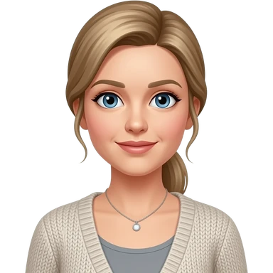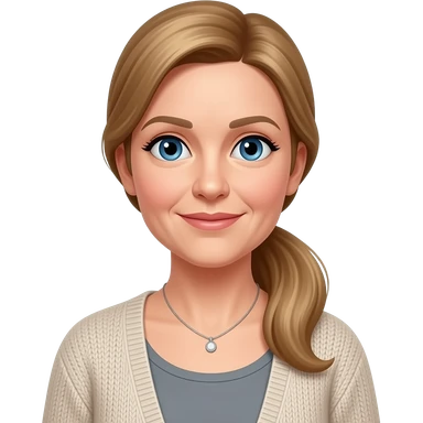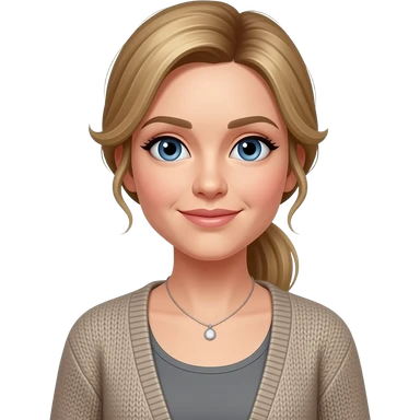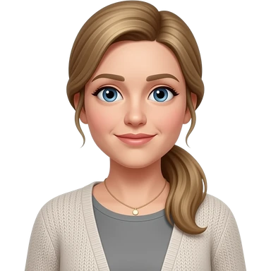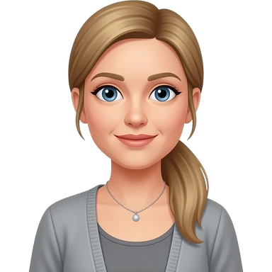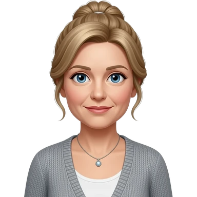 pink cheeks, smaller Blue eyes, light skin, longer blonde/brown hair pony tail, 38 aged women, cardigan, grey top,small necklace, emoji