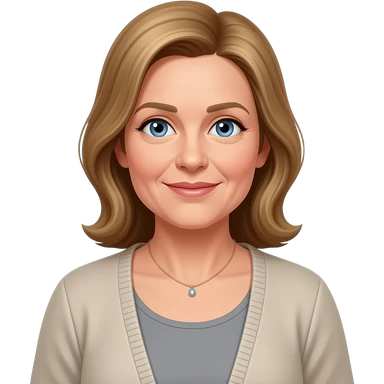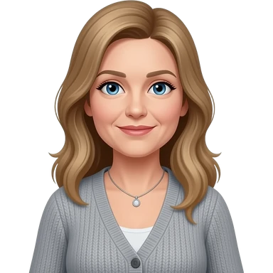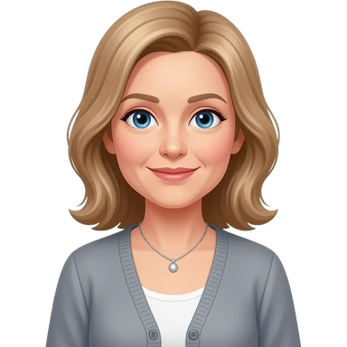 Blue eyes, fair skin, longer blonde/brown hair, middle aged women, cardigan, grey top,small necklace emoji