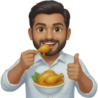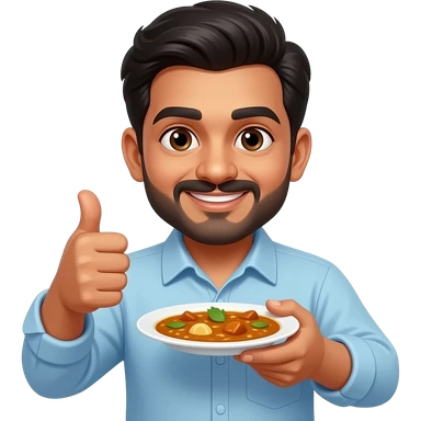 An Indian man eating yellow chicken and curry with his thumbs up emoji