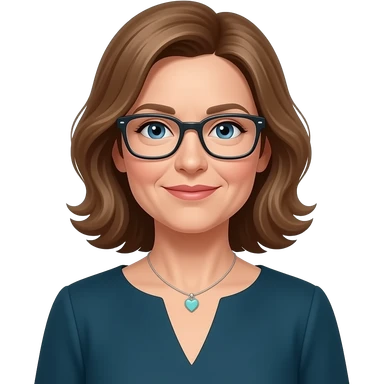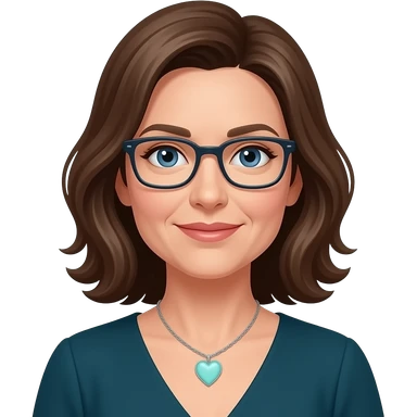 AJM - woman, blue eyes, mid 40's age, mid brown hair, rectangular glasses, shoulder length wavy hair, small tiffany heart necklace, dark teal dress, emoji